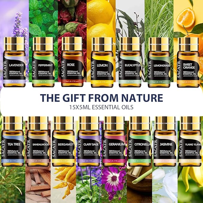 SACATR Essential Oil Diffusers for Home with 15 Oil Diffuser Sets, 500ml Aroma Diffuser for Essential Oils Large Room, Ultrasonic Cool Mist Diffuser Auto Shut-Off 4 Timers 15 Colors (15x5mL)