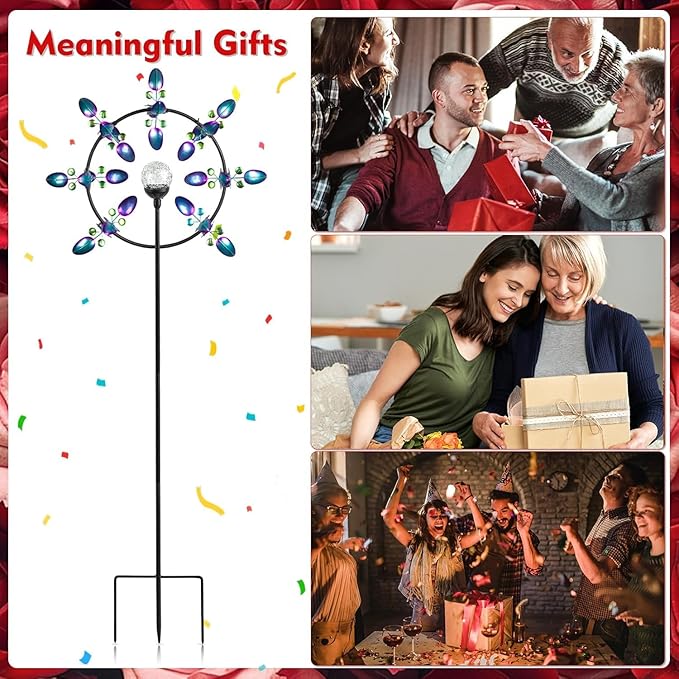 - 【Solar Powered Wind Spinners】Features a color changing LED crackle glass ball light which is powered by solar, gorgeous color tiers blades, and a durable metal garden stake. As night falls, it flashes a soft, jewel-like light, bright metal and changing lighting create visual enjoyment in the garden.