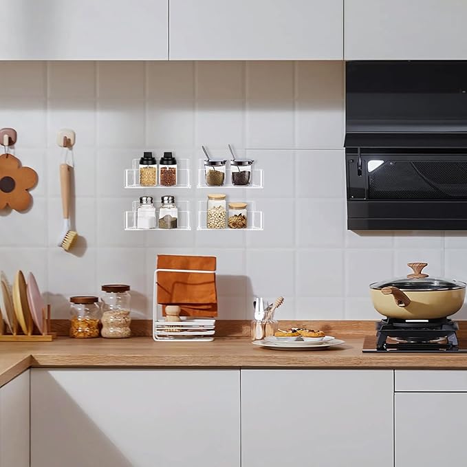 Acrylic Spice Rack Wall Mount-6 Inch, Clear Spice Shelf Storage Holder, 2 Pack Hanging Seasoning Rack Organizer for Cabinet Door, Cupboard or Wall Kitchen (Adhesive or Screw)