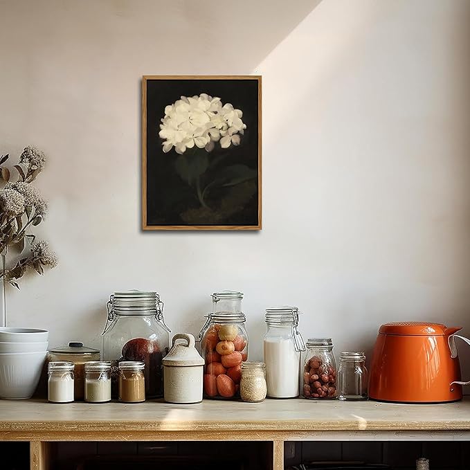 - Framed Canvas Wall Art: This vintage white hydrangea oil painting print adds a touch of botanical elegance to any room. Its classic floral design is ideal for enhancing the ambiance of your living room, bedroom, kitchen, or office with timeless charm.