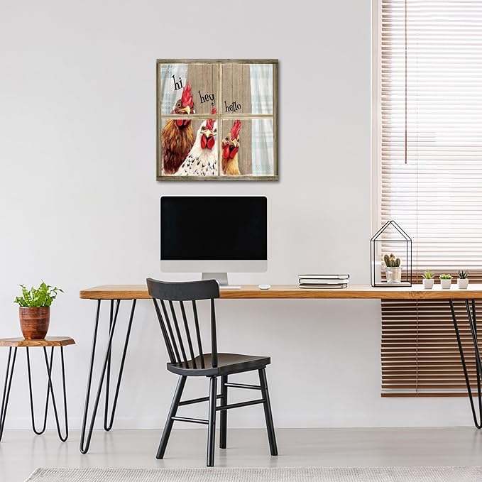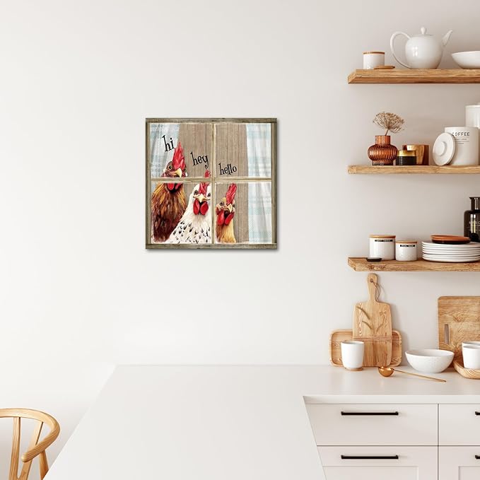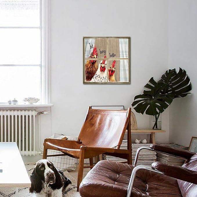 - FARMHOUSE DESIGN: Charming rustic wall art featuring three playful chickens peeking through a vintage window frame with greetings