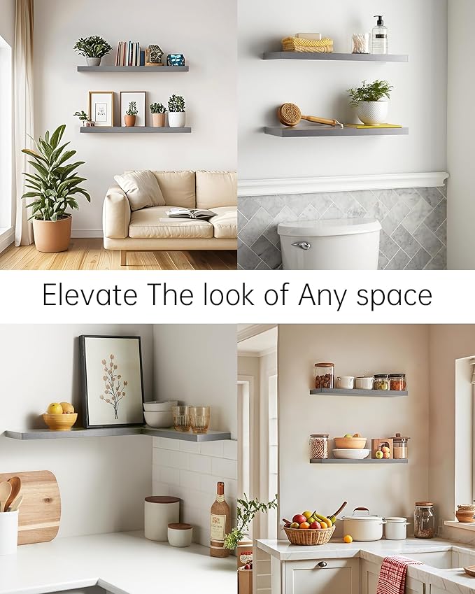 BAYKA Floating Shelves, 22.5" Wall Mounted Wood Shelves for Bathroom, Bedroom, Living Room, Kitchen, Hanging Shelf for Books/Storage/Decor (Grey,Set of 2)