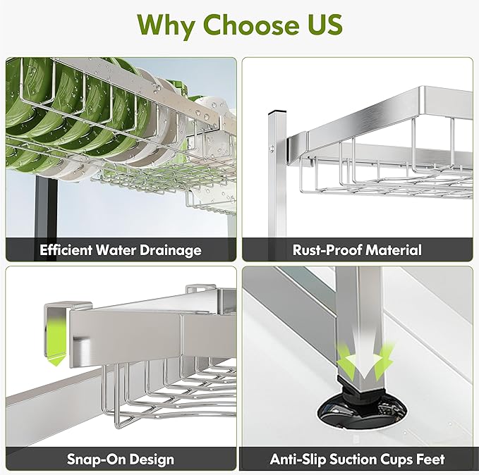 - 🔩 Sturdy & Rust Resistant Construction: Crafted with heavy duty stainless steel and reinforced welding, this over the sink dish drainer drying rack resists corrosion and daily wear. Its industrial grade framework securely holds bulky pots, pans, and dishware without sagging, even when fully loaded, ideal for families seeking a lasting solution to countertop clutter