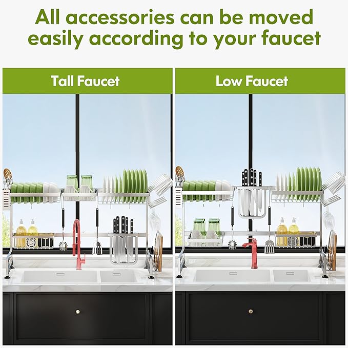 - 🔄 Expandable Design for Custom Fit: Adjust the over sink dish drying rack width effortlessly to span most standard single or double sinks, adapting seamlessly to your kitchen layout. The dish drain modular design allows rearranging tiers and accessories to prioritize space for tall glasses, wide pans, or cleaning tools, maximizing vertical storage above the sink