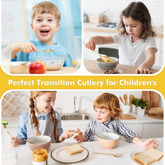 - IDEAL TRANSITIONAL CUTLERY: This set of 6 includes 3 kid forks and 3 kid spoons in gold. Ample quantity for daily needs by toddlers, kids, preschoolers, and school-age children, and allows for an easy transition to full-sized utensil