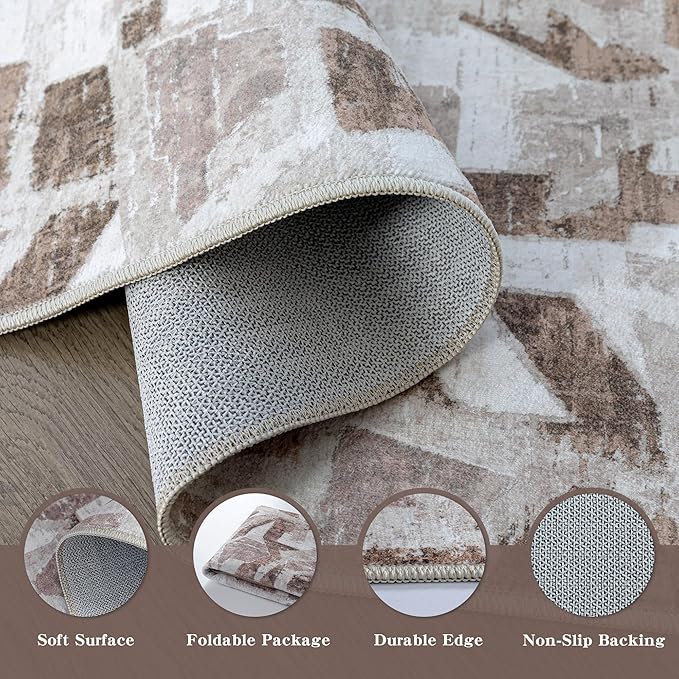 Modern Abstract 5X7 Area Rug for Living Room Bedroom Washable, with Non-Slip Rubber Backing Print Faux Wool Thin, Brown Throw Large Carpet for Kids Playroom Dining Room Pet & Child Friendly