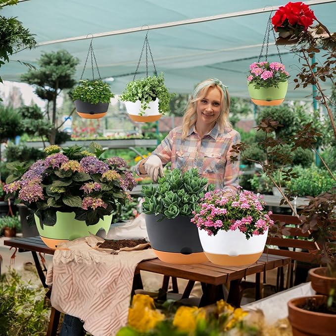 - 【Self-Watering Hanging Flower Pots with Removable Saucer】The innovative recessed design under each hanging indoor planter maintains optimal water levels for your plants and serves as a reservoir for consistent watering. This feature eliminates the hassle of watering plants while you're away on business trips or traveling, thanks to our hanging plant pot.