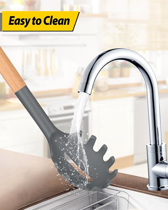 Silicone Pasta Fork and Ladle Spoon Set with Wooden Handle, Heat Resistant Non Stick Kitchen Utensils for Cooking, Stirring, Serving Spaghetti, Soup, Sauce(GRAY)