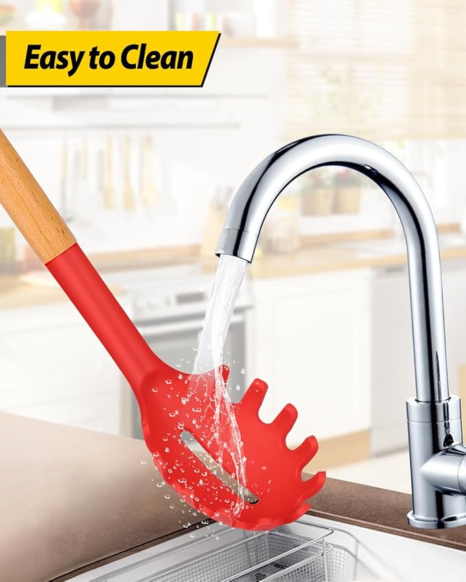 Silicone Pasta Fork and Ladle Spoon Set with Wooden Handle, Heat Resistant Non Stick Kitchen Utensils for Cooking, Stirring, Serving Spaghetti, Soup, Sauce(RED)