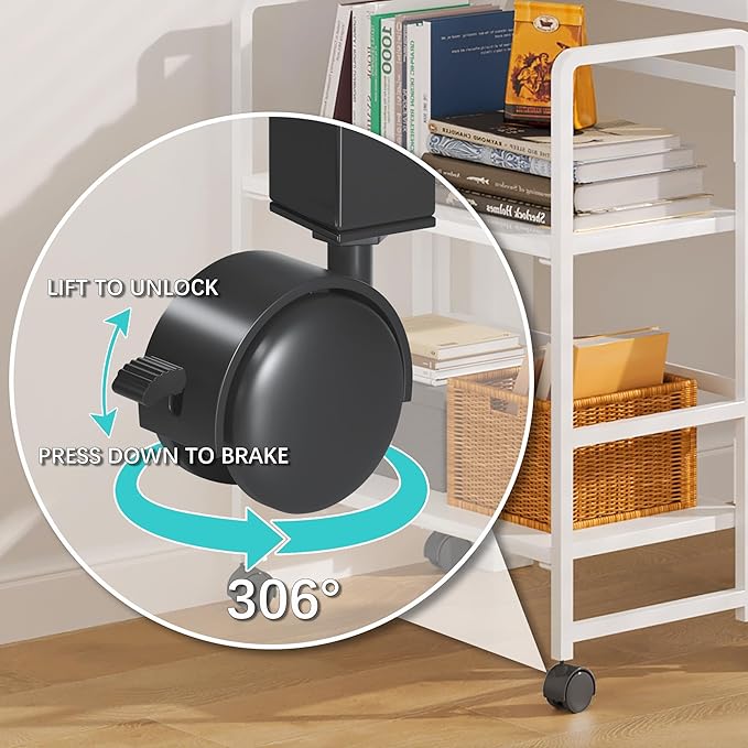 4NM 2 Tiers No-Assembly Folding Bookshelf with Wheels, Portable Rolling Storage Bookcase & Compact Side Table for Living Room, Bedroom, Kitchen, Bathroom (All White)