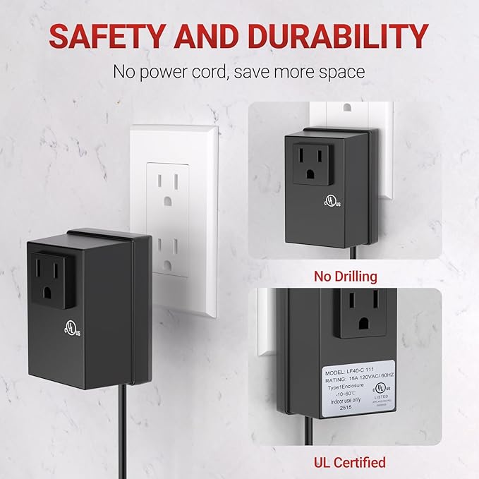 - Easy Installation: Plugs into an outlet and works without the need for installation tools. You can also drill your own holes if there are not pre-drilled hole.