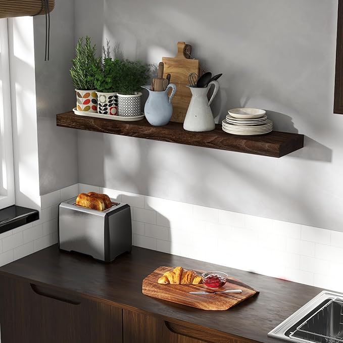 - REAL SOLID ELM WOOD: These elegant elm wood floating shelves showcase the natural beauty of solid timber with a clean, minimalist design. The rich, warm tones and distinctive grain patterns of elm create organic visual interest, while the smooth, sanded surface offers a soft tactile feel.