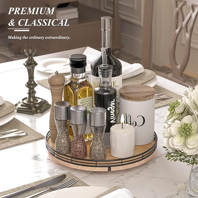 - PREMIUM MATERIAL: Our farmhouse lazy Susan organizer is made of natural solid oak wood and strong metal, sturdy, durable and premium quality. This wooden turntable organizer is a game-changer for keeping your kitchen organized. The farmhouse oak finish gives it a rustic, charming look that will fit perfectly with your kitchen decor.