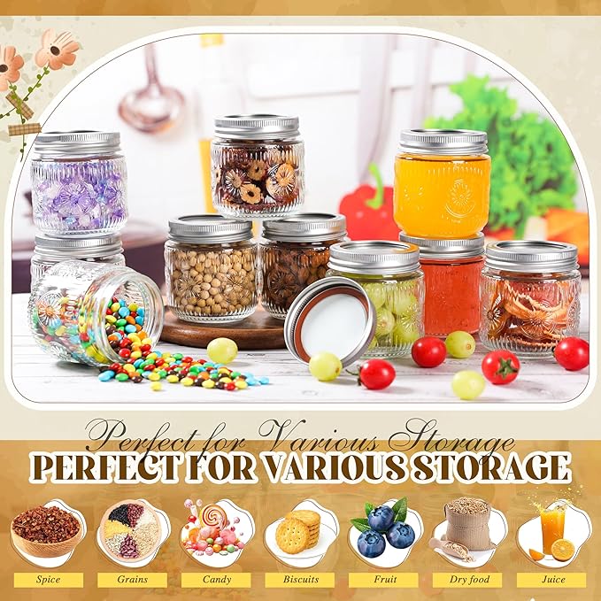 - APPROPRIATE CAPACITY: Each 8oz glass jars perfect for canning jams, jellies, honey, or storing spices and herbs. Also great for DIY crafts, wedding favors, and home décor.
