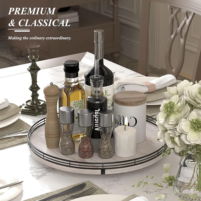 - PREMIUM MATERIAL: Our farmhouse lazy Susan organizer is made of natural wood and strong Iron, sturdy, durable and premium quality. This wooden turntable organizer is a game-changer for keeping your kitchen organized. The farmhouse finish gives it a rustic, charming look that will fit perfectly with your kitchen decor.