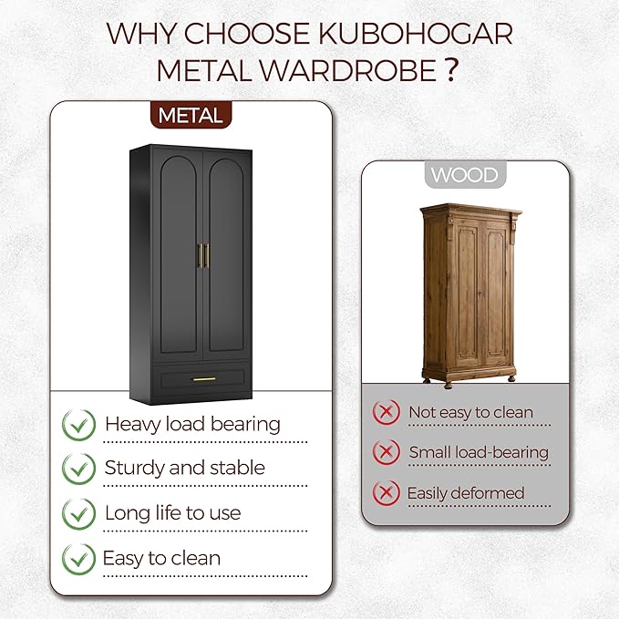 - High Quality Material: The armoire wardrobe closet is made of thickened cold-rolled steel plate, which is strong and not easy to deform. The metal wardrobe cabinet is treated with environmentally friendly powder coating, which is resistant to moisture, corrosion and rust, and is more durable than wooden cabinets.