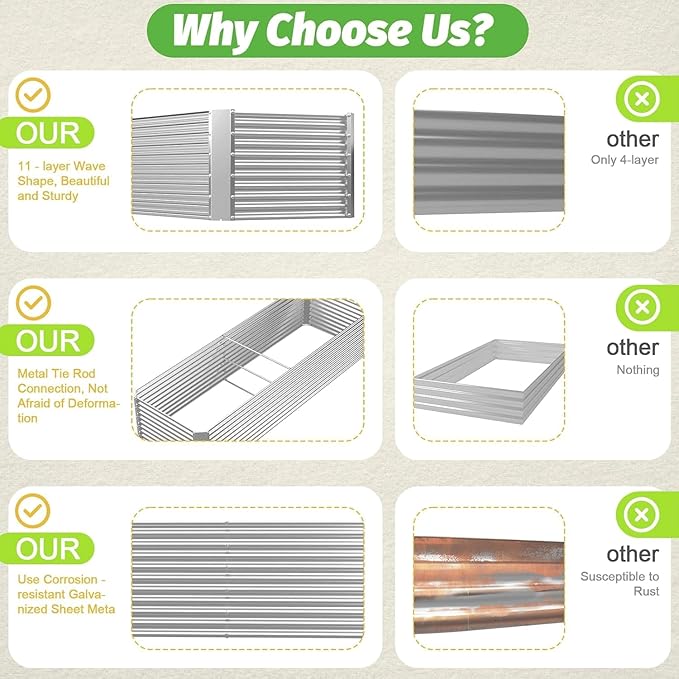 - 【Durable Galvanized Steel Construction】:Crafted with high-quality galvanized steel, this metal raised garden bed is built to last. The anti-corrosion coating ensures long-term durability, while the sturdy structure withstands heavy soil and weather conditions, making it perfect for outdoor use. Unlike traditional wooden garden beds, it resists warping and rotting over time.