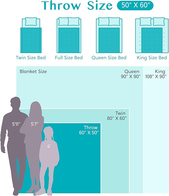 - All-Season Comfort in Every Size: Choose your size from 50”x60” (2 lb), 50”x70” (2.4 lb), 60”x80” (3.3 lb). Lightweight yet, it’s made for every season—from chilly summer nights to full winter mode. Drape it over your office chair, toss it in the car, or bring it along for picnics—it’s cozy comfort wherever you go.