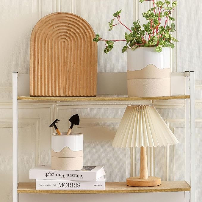 Nihow Self Watering Plant Pot: 4.5 Inch Ceramic Planter with Drainage Hole & Water Storage Plus for Indoor & Outdoor Plants - Cylinder Flower Pot for Herbs/Violets - White & Nature