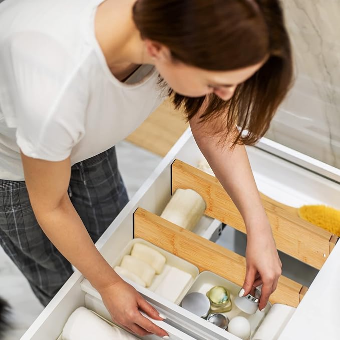 - Package Includes: you will receive 6 bamboo kitchen drawer dividers and 1 bamboo expandable drawer organizer; These can be installed in your kitchen, bedroom, living room, bathroom, closet, desk, and office drawers; Effortlessly separate items and keep your drawers clean and tidy with this versatile set