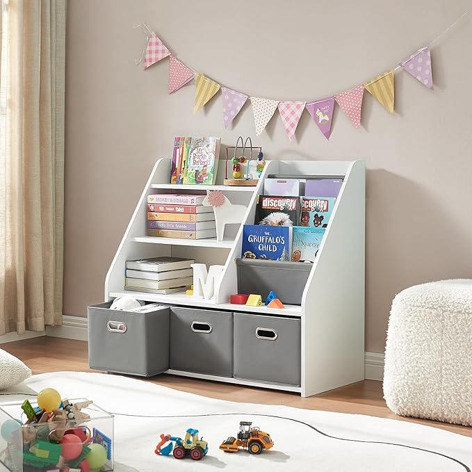 - Versatile Storage Organizer: This multi-functional organizer features 3 storage bins, a 3-tier wooden bookshelf, and a display shelf, accommodating books of all shapes and sizes. It also offers ample space for building blocks, small trucks, plush animals, model cars, dolls, memorabilia, art supplies, and more. Its space-saving design ensures that books and toys are neatly organized and easily accessible.