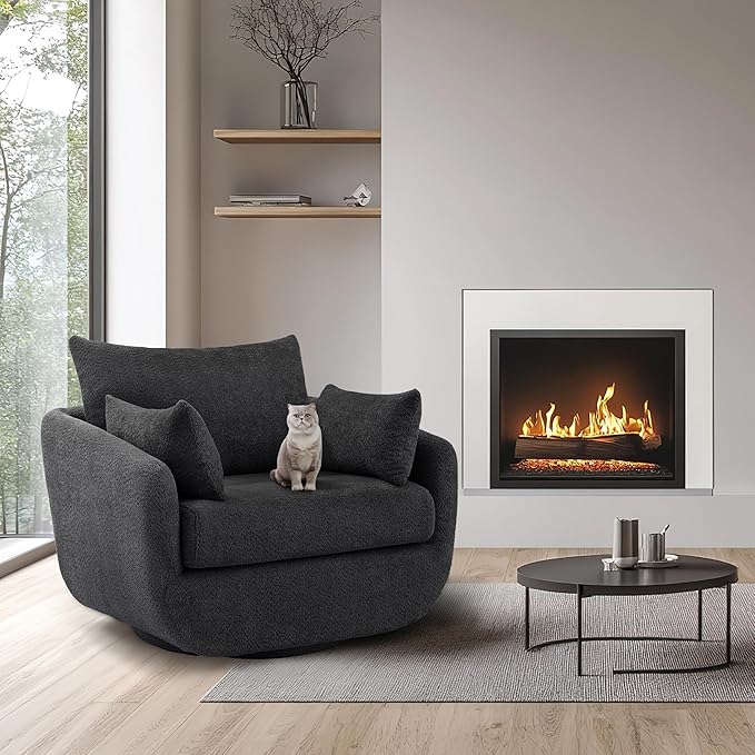 360° Swivel Accent Armchair, 39.3" Oversized, Sherpa Boucle Fabric Sofa Chair with Removable Back & Arm Pillows, Swivel Chair with Cozy Soft Padded, No Assembly Required (1, Dark Gray)