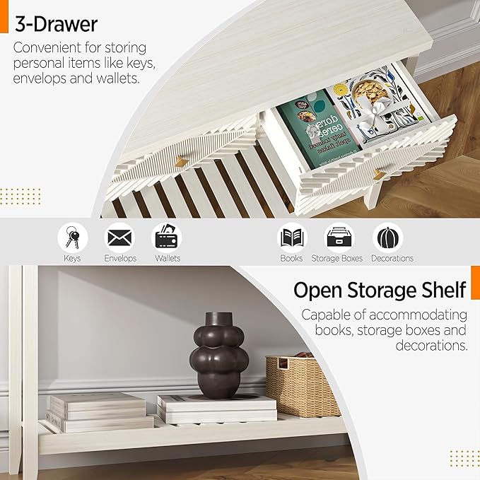 - Multi-Level Storage Space: This entry console table offers a sophisticated blend of functionality and style with its tabletop surface perfect for display or everyday use, complemented by 3 spacious drawers that elegantly conceal clutter. Additionally, the open storage shelf beneath provides easy access to frequently used items, creating an organized and visually appealing space in living room, foyer, or hallway