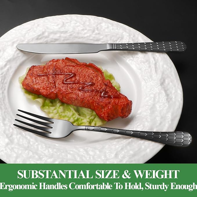 - WONDERFUL WORKMANSHIP AND FUNCTIONAL---Our black utensils set is made of multiple mirror polishing treatment, silverware set with Water Cube handle design Each piece is beautifully adorned with a delicate Water Cube pattern,edge smooth , elegant and classical appearance, adding to the beautiful experience of everyday dining.