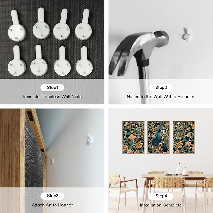 - Simple To Install: Each of these three beautiful flower and peacock art prints pieces measures 16x24inches. It comes with all the necessary accessories so it's simple and easy to install. Simply choose where you want to decorate, make sure it's level and aligned the way you want it, and then nail it down with non-marking nails.