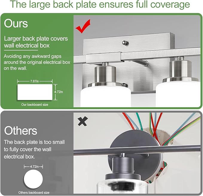 - Soft, Glare-Free Lighting with Frosted Glass: Milky white frosted glass shades deliver warm, diffused light—perfect for grooming, makeup, or creating a relaxing ambiance. These bathroom lighting fixtures over mirror provide both style and function. The open-bottom design ensures easy bulb changes and improved ventilation.