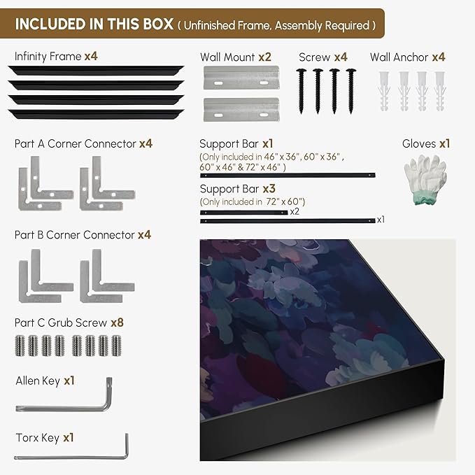 - Assembly Required: The artwork comes with the frame components unassembled. Don¡¯t worry ¡ª setup is straightforward and tool-friendly. For best results and accurate alignment, we recommend two people to ensure a smooth assembly and a stable, secure wall mount.
