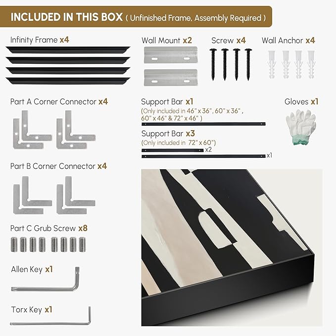 - Assembly Required: The artwork comes with the frame components unassembled. Don’t worry — setup is straightforward and tool-friendly. For best results and accurate alignment, we recommend two people to ensure a smooth assembly and a stable, secure wall mount.