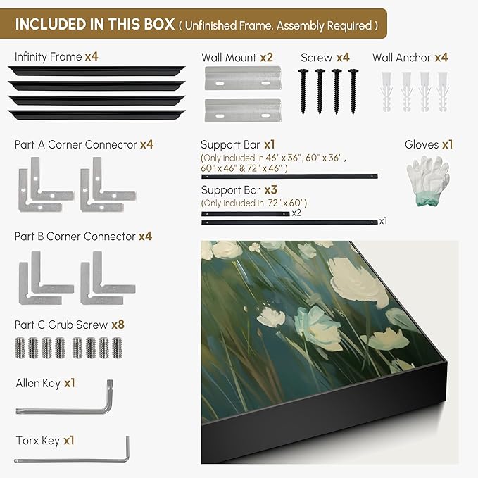 - Assembly Required: The artwork comes with the frame components unassembled. Don’t worry — setup is straightforward and tool-friendly. For best results and accurate alignment, we recommend two people to ensure a smooth assembly and a stable, secure wall mount.