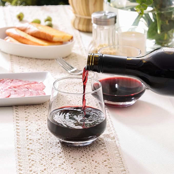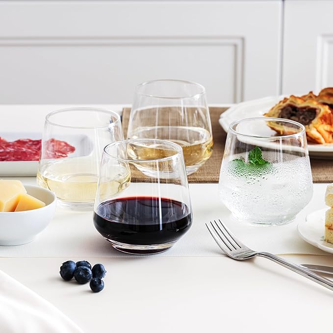 - 【Sturdy Base - Modern Design】: Stemless wine glasses with a thick bottom for stability, no fears of knocking it over. Modern style red wine glasses curve to perfectly fit in your hand. The exquisite and perfect wine glass tumbler allows you to fully enjoy your white wine glasses to the last sip. Perfect for daily use or entertaining your guests