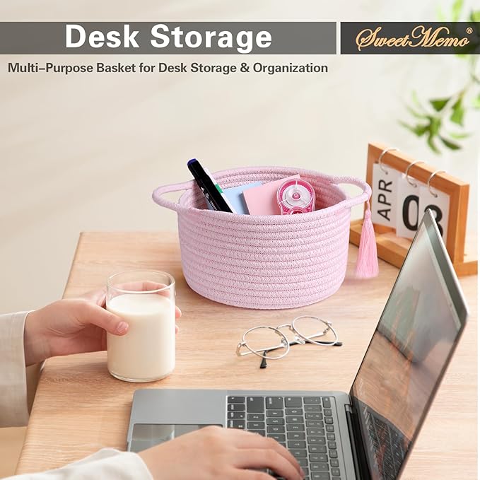 - 【Vanity & Bedside Pink Storage Basket】Aesthetic and functional, this pink rope basket is perfect for organizing beauty essentials, lip gloss, hair ties, or bedtime items. Use it on a vanity table, nightstand, or makeup station as a pink makeup organizer, jewelry holder, or bedside storage bin. A cute and compact addition to any girl’s room or dorm.