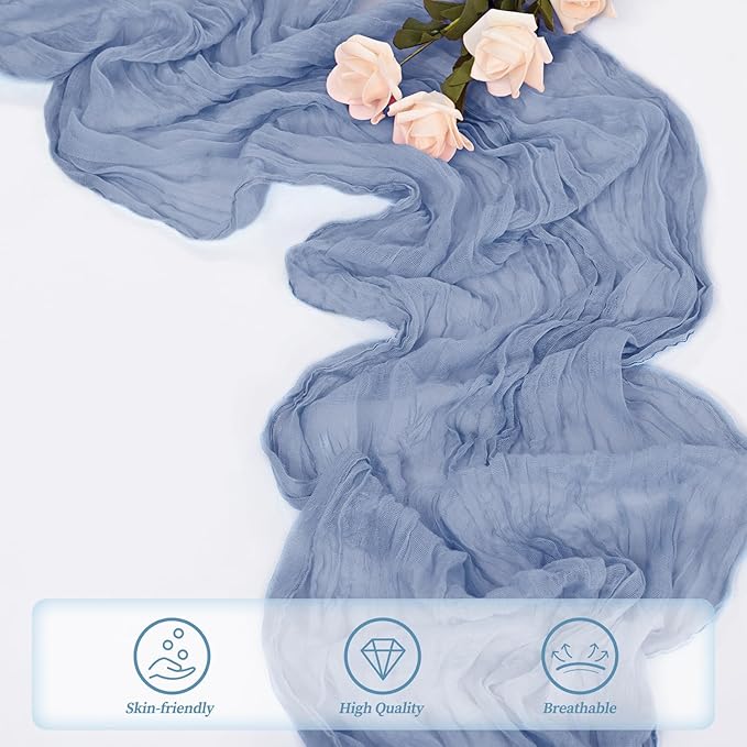 - Cheesecloth Table Runner Size: You will receive 6 dusty blue cheesecloth tablerunner, each measuring 20 x 120 inches. The quantity is sufficient for you to decorate various romantic occasions. It can decorate most shaped tables, such as rectangular tables, round tables, and cocktail tables. It is long enough to decorate a large table and be placed perfectly and elegantly on the tabletop, adding a romantic atmosphere to your occasion.