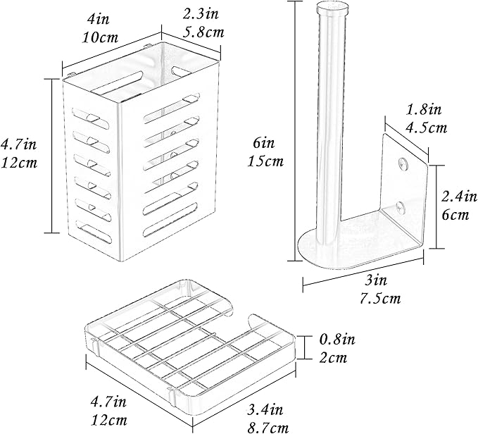 - Included Components : 1 Soap Holder, 1 Tissue Holder, 1 Utensil Holder, 2 Adhesives, 2 Hanging Storage Baskets