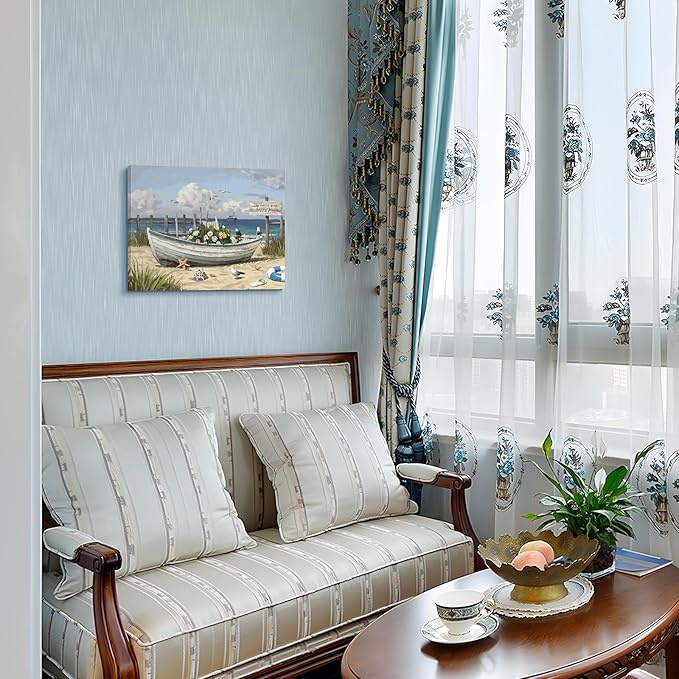 - Coastal Serenity for Your Space: Bring the tranquil beauty of the seaside into your home with this 16x12 inch beach wall art. Featuring a peaceful boat resting on the sandy shore, surrounded by gentle ocean waves, blooming coastal flowers, delicate seashells, and soaring seabirds, it adds a soothing, coastal charm to any room — from bathroom to bedroom, hallway to beach house.