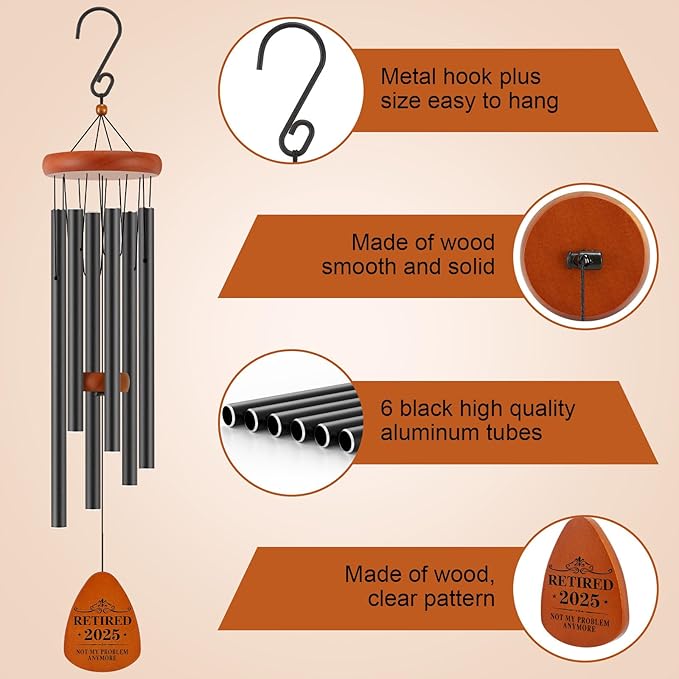 - Unique Retirement Decoration: This wind chime is 32 inches long from the hook to the bottom of the wind chime. The 6 black aluminum tubes range in length from 10 inches to 13 inches. It's a perfect size. Whenever the wind blows, it brings pleasant notes.Expertly crafted, this wind chime is a stunning addition to any space. Whether indoors or outdoors, it enhances your home, garden, patio, or backyard. Hang it from a tree, balcony, porch, or anywhere you desire
