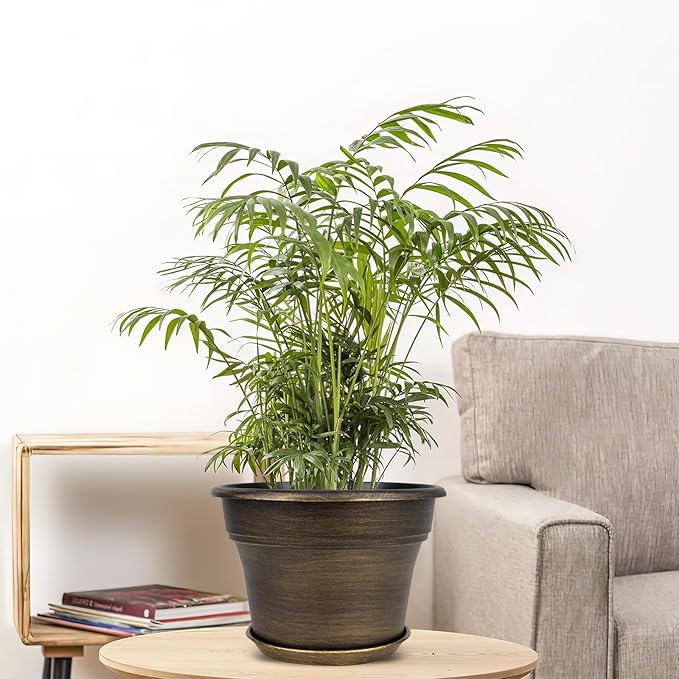 - 【TRADITIONAL DESIGN】Plastic planters for indoor plants with trays are designed in dark gold colors & a classic round look, which allow this pot to fit into any indoor & outdoor setting. With these golded flower pots, it could adds fresh, decorative flair to your home. Decorate your windowsill, desktop, shelf, bedroom, living room, kitchen, garden, office with our 8 inch plastic plant pot.