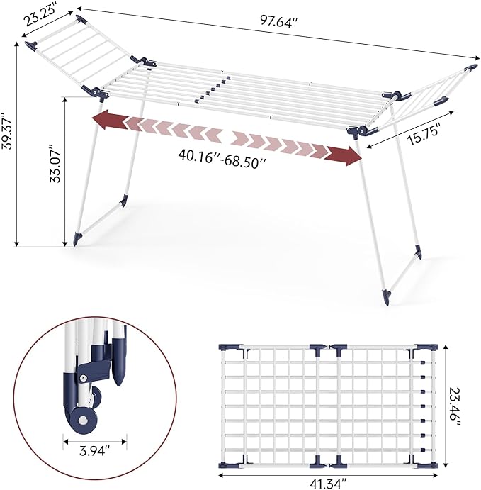 - Large Drying Capacity - The drying space of Apexchaser clothes drying rack is 97.6" X 23.2" X 39.4". The clothes airer has 9 long pipes which can be extended and 12 short pipes which can dry a full load of clothing in one go
