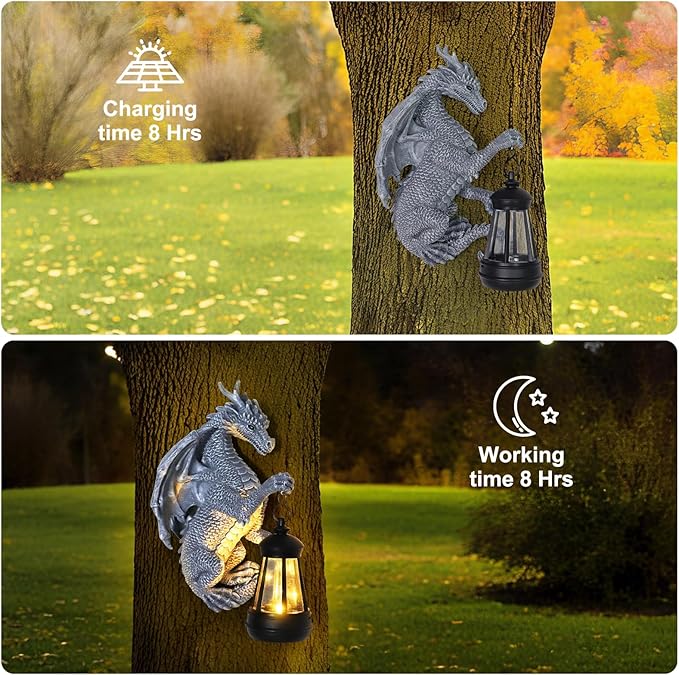 - Compact yet impactful dragon statue outdoor! Measuring 9.4 inches, this dragon figurine fits perfectly in gardens or on walls. The resin build is tough, with a back groove for safe hanging, making it a practical dragon decor choice. It’s not just a statue but a charming dragon light that enhances any space.