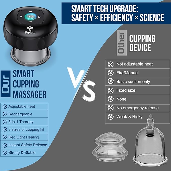 - 【5-in-1 Comprehensive Care】Combines standard cupping, dynamic cupping, red-light therapy, heat therapy, and cellulite relief in one device—perfect for gym recovery, office breaks, and on-the-go treatments.