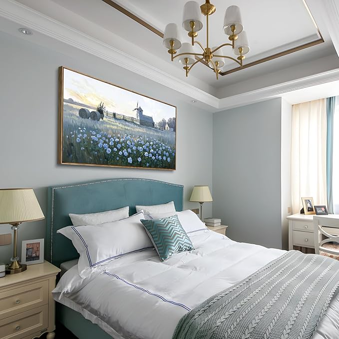 - Country Breeze in Bloom: Immerse your space in the quiet romance of rural living with this charming blue barn flower framed canvas art. A serene field of blue garden flowers stretches beneath a warm sky, with a rustic farmhouse and vintage windmill tucked gently into the horizon. This piece blends floral grace with countryside simplicity—bringing a soft, cozy feel to your farmhouse entryway, dining room, or guest bedroom.