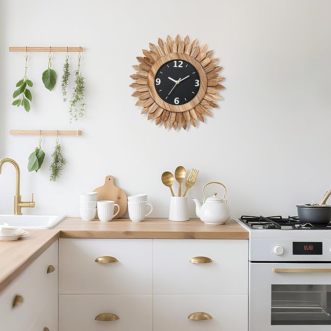 - Boho Wall Decor Clock: Inspired by the sunburst of Bohemian style, this modern wall clock face design is unique and eye-catching, 2 tier wood sunburst looks like the "sun". With a black wooden case, white hour, minute and seconds hands and large white arabic numerals, this decorative wall clock is easy to read from a distance