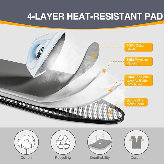 - 3-Layer Ultra-Thick Padding -Enjoy premium protection with a thick, three-layer padded cover that provides excellent cushioning and steam absorption. The special heat-resistant coating shields your garments from scorching and ensures smooth gliding and even heat distribution.