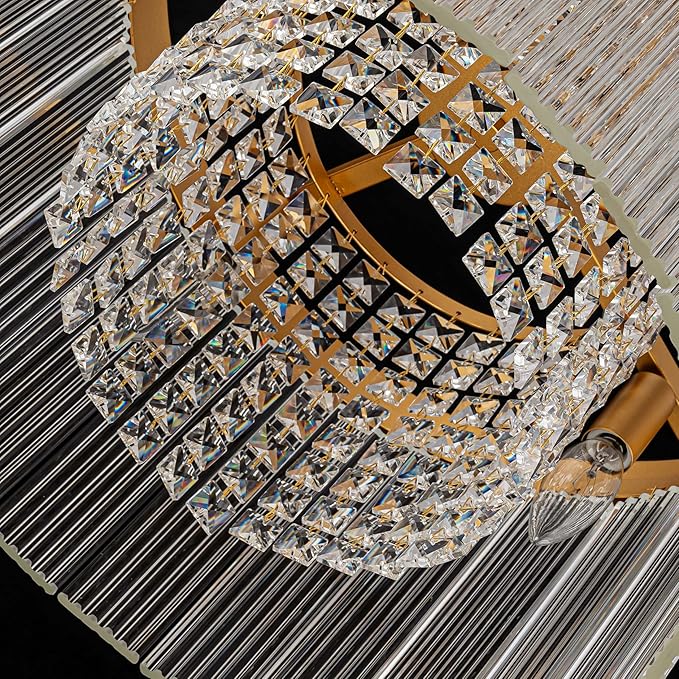 - Gorgeous Appearance: This crystal chandelier showcases a durable metal material frame in a warm brass hue. Cascading gracefully from the frame are shimmering K9 crystal pendants, their clear, prism - like surfaces capturing and refracting light to create a dazzling glow. Complementing these is the ripple glass shade, adding a subtle textural contrast. Together, the elegant fusion of metal, K9 crystal, and ripple glass suits grand dining rooms, chic living spaces, or even upscale hotel lobbies, infusing any area with radiant luxury.