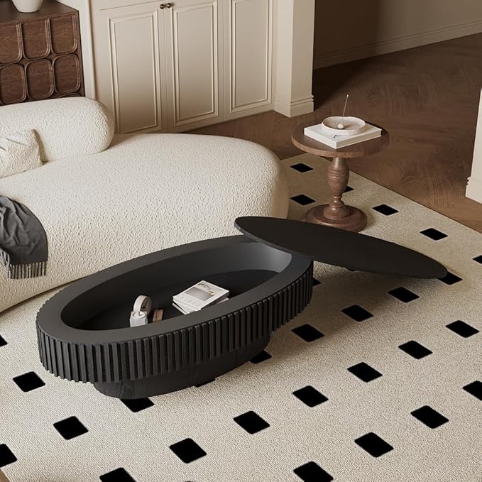 47.2''Oval Coffee Table with Storage, Mid Century Modern Fluted Drum Center Tables with Lid, Solid Wood Side Pedestal Coffee Table Tea Table for Living Room, Bedroom, Apartment-Black