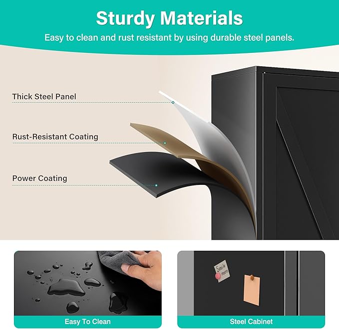 - Sturdy,Durable and Safe: Made of powder-coated steel plate, wide & deep cabinet with door and shelf is sturdy,durable and easy to clean.Load capacity is up to 120lbs each shelf. The included anti-tip kit helps secure the pantry cabinets to the wall to give you a safer living space.