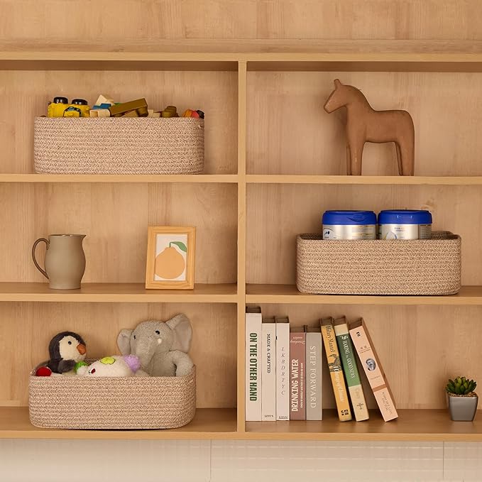 - [ Stylish & Versatile ]: Great for organizing small items on desks, in closets, wardrobes, or dressers—these cute baskets add texture to any living room, bedroom, or bathroom, appealing to fans of modern minimalist design